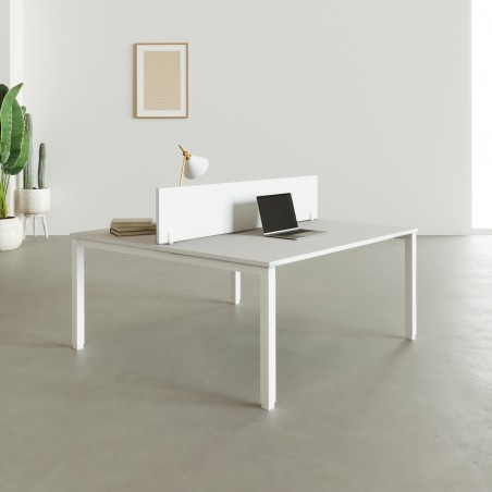 Dit benchbureau wordt geleverd met een scheidingspaneel van 32 cm hoog, gemaakt van wit melamine, dat eenvoudig met klemmen aan het bureau wordt bevestigd. Dit zorgt voor extra privacy en helpt geluidsoverlast te verminderen, wat de concentratie bevordert.