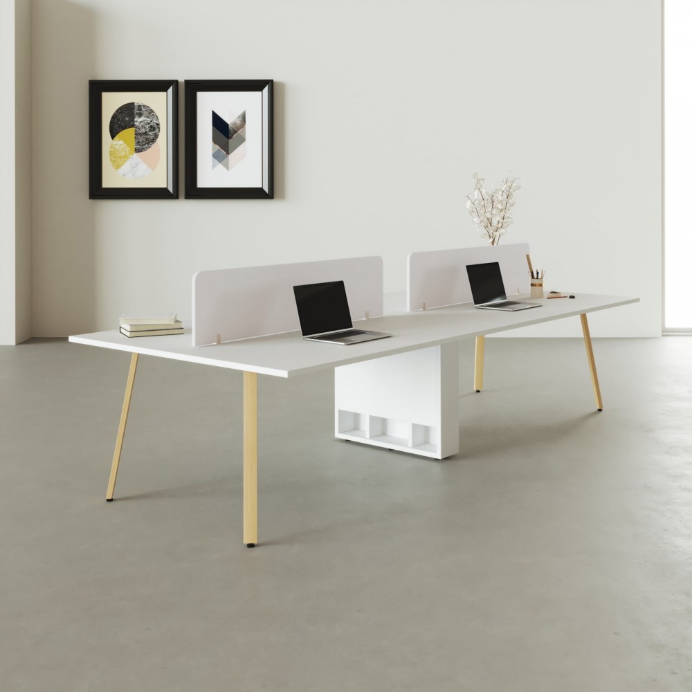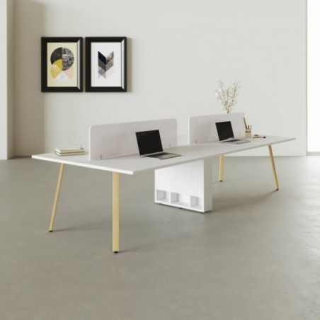 De Bench Genius Wood brengt een natuurlijke en warme uitstraling naar de werkplek door zijn massieve houten poten en hoogwaardige afwerking. Dit duobureau voor vier personen is ontworpen om stabiliteit, comfort en efficiënt kabelbeheer te combineren. Het werkblad is vervaardigd uit melamine met afgeronde randen, wat zorgt voor duurzaamheid, prettig gebruik en een nette afwerking. Het 38 cm hoge scheidingspaneel, verkrijgbaar in melamine of een gestoffeerde variant, biedt extra privacy en creëert een rustige werkomgeving, waardoor deze benchtafel ideaal is voor open kantoren en teamwork-ruimtes.