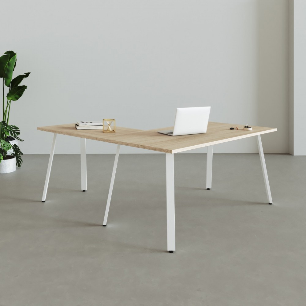 Het L-vormige bureau rust op een sterke metalen structuur in omgekeerde U-vorm, vervaardigd uit koudgewalste stalen buizen van 50x30 mm. De constructie wordt versterkt door een perimetrisch frame van 30x20 mm, wat extra stabiliteit garandeert. De witte epoxycoating (RAL 9016) beschermt tegen krassen en geeft deze hoektafel een professionele, frisse uitstraling. Aan de onderzijde zorgen antislip-niveauers voor een perfecte stabiliteit op elke vloer.