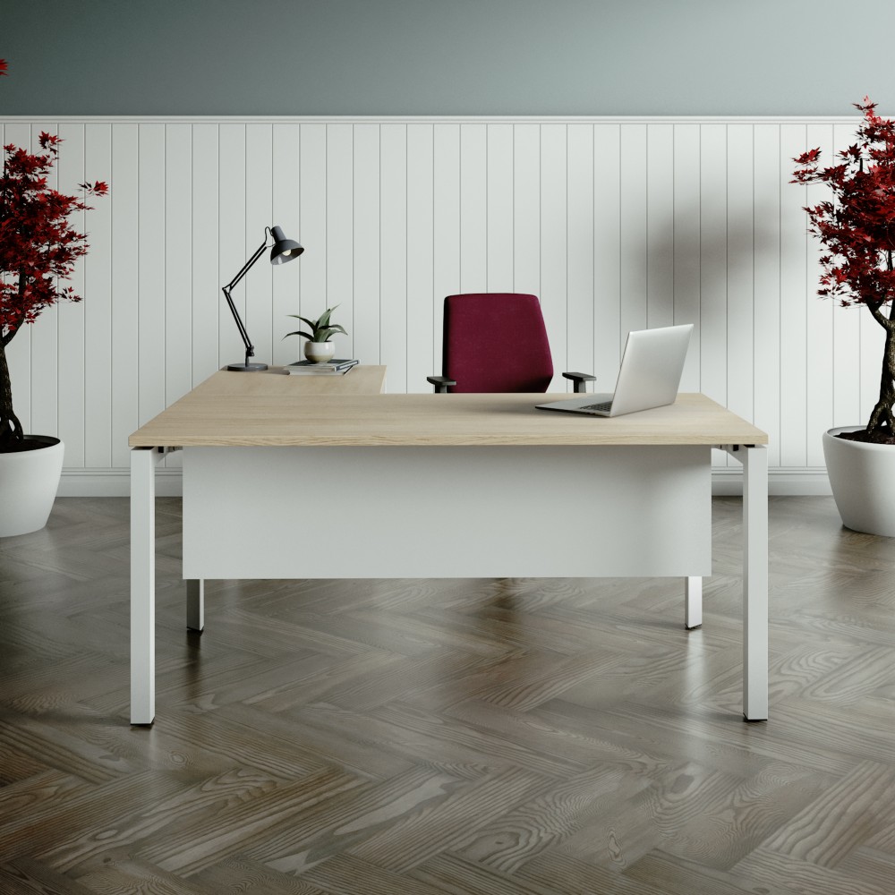 Het Estela hoekbureau is ontworpen met maximale flexibiliteit in gedachten. Dankzij het omkeerbare zijblad, dat eenvoudig zowel links als rechts gemonteerd kan worden, pas je het bureau naadloos aan elke kantoorruimte of thuiskantoor aan. Of je nu meer ruimte wilt aan de linker- of rechterkant, Estela geeft je de vrijheid om je werkplek optimaal in te richten, helemaal afgestemd op jouw wensen en beschikbare ruimte.