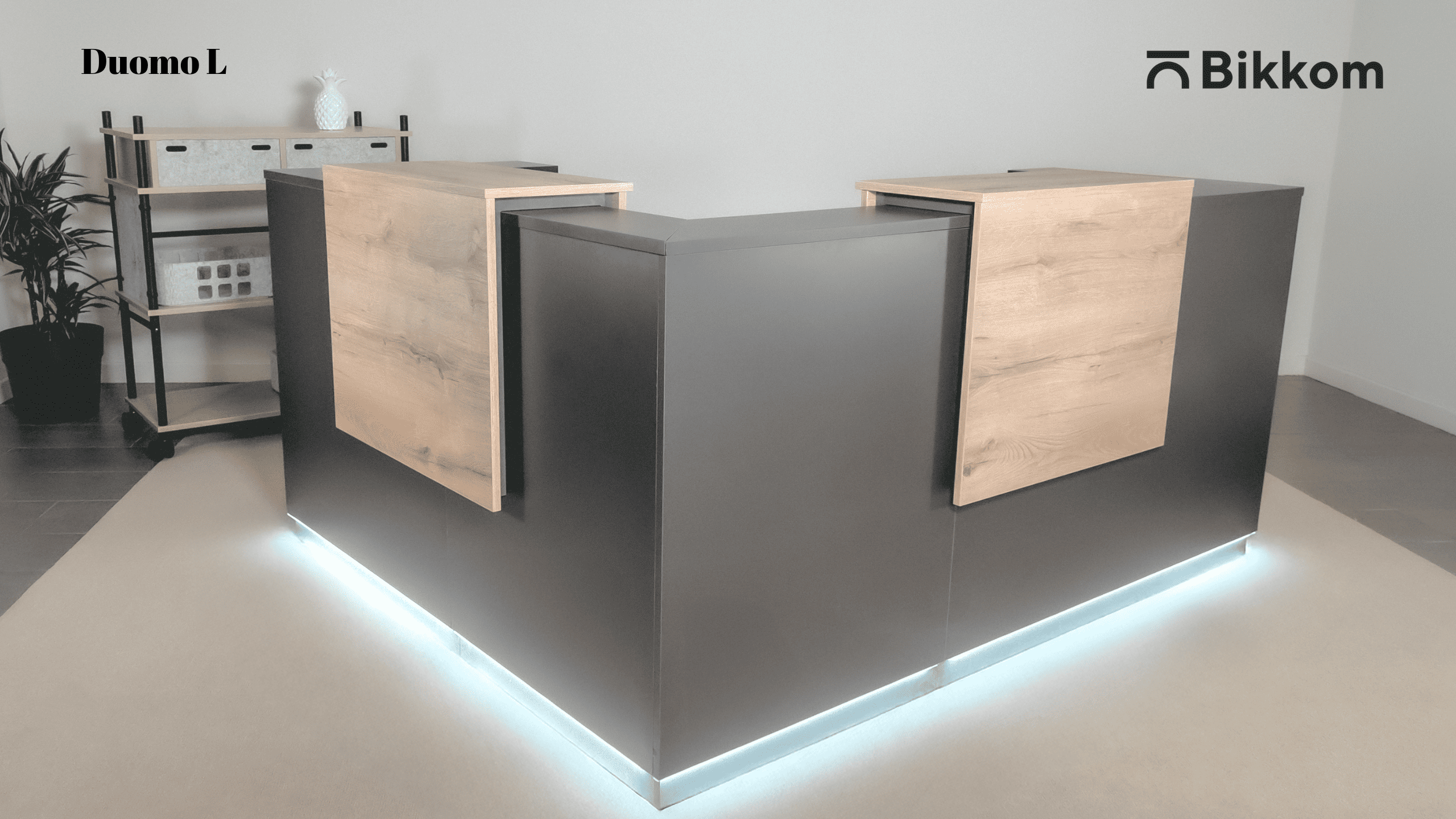 De L-vormige receptiebalie Duomo is ontworpen met het oog op functionaliteit en stijl, perfect voor moderne kantoren en ontvangstruimtes. Dankzij het slimme L-vormige ontwerp benut je de hoek van de ruimte optimaal. Dit zorgt voor een ruime, overzichtelijke werkplek waar je alle receptietaken moeiteloos uitvoert, van het ontvangen van bezoekers tot het organiseren van documenten en apparatuur. Zo straal je meteen een professionele en uitnodigende sfeer uit.