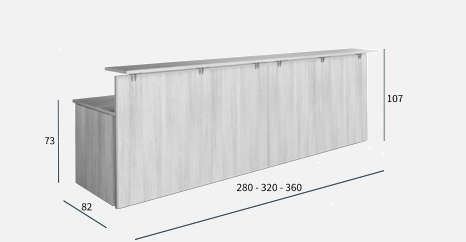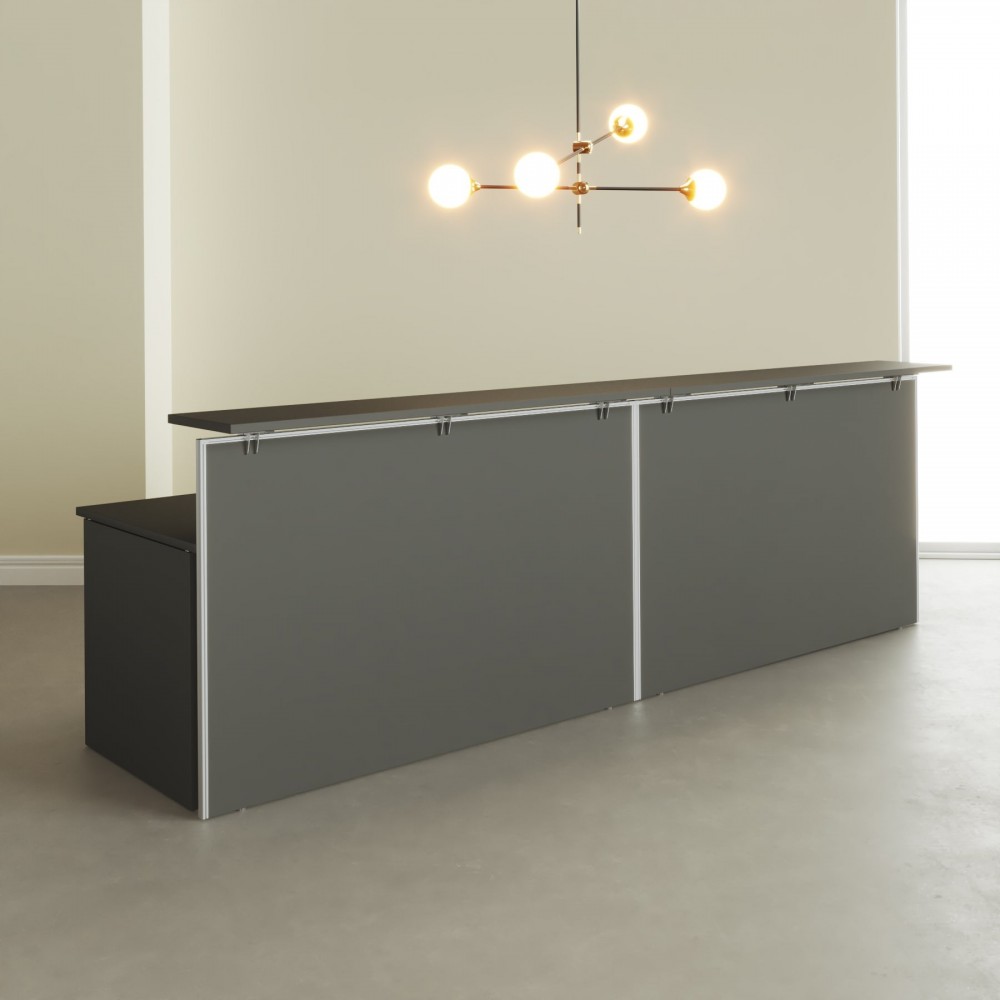Het bovenblad is met metalen klemmen aan de structuur bevestigd en afgewerkt met zilverkleurige epoxyverf (RAL 9006), wat de balie een moderne, professionele uitstraling geeft. Aan de binnenzijde biedt de Bello-balie voldoende werkruimte voor een computer, documenten en kantooraccessoires, zodat medewerkers georganiseerd kunnen werken en de receptie altijd netjes en overzichtelijk blijft.