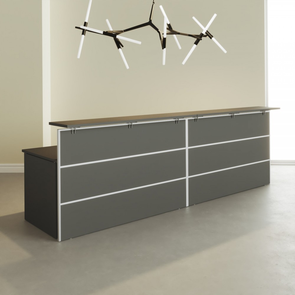 Het werkblad en bovenblad zijn vervaardigd uit duurzame melamine en afgewerkt met afgeronde ABS-randen. Dit biedt een slijtvaste, onderhoudsvriendelijke afwerking die intensief dagelijks gebruik moeiteloos aankan. De verticale panelen vormen een stabiele structuur en geven de balie een solide, professionele uitstraling die past bij moderne kantooromgevingen.