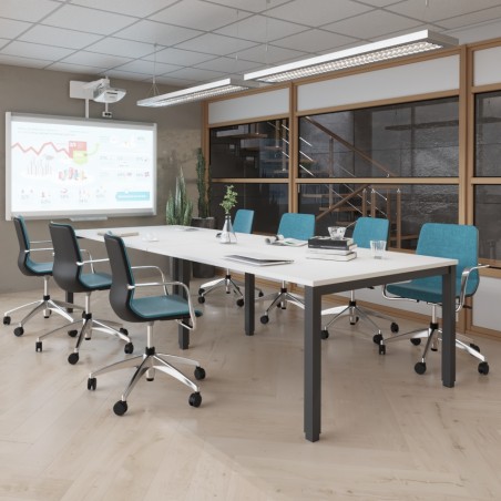 De Modus vergadertafel is ontworpen voor professionele vergaderruimtes waar uitstraling en duurzaamheid centraal staan. Het 25 mm dikke melamine werkblad met afgeronde 2 mm randafwerking is krasbestendig, onderhoudsvriendelijk en geschikt voor intensief dagelijks gebruik. Voor grotere opstellingen van 300 en 450 cm worden modulaire werkbladen van 150 x 120 cm gebruikt, wat zorgt voor meer flexibiliteit bij transport, montage en inrichting.